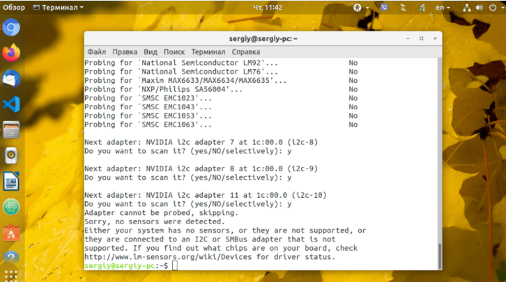 Answer Y to all questions — the utility will scan i2c/SMBus buses, detect sensors, and identify the appropriate kernel modules.