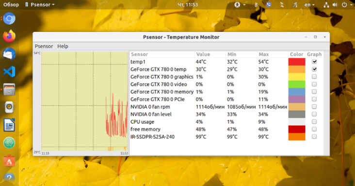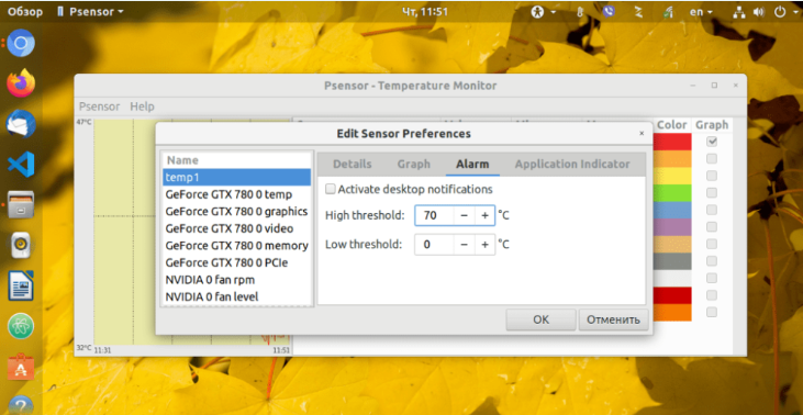 When a threshold is reached, psensor shows a desktop notification. Useful during long computations or rendering — no need to keep watching the terminal.