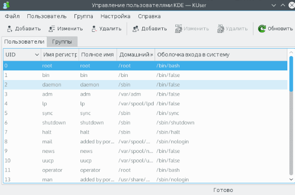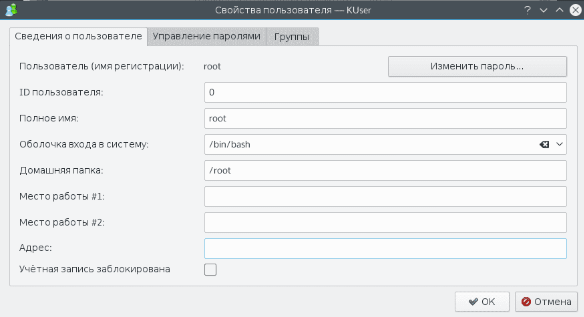 The KDE Plasma environment includes KUser, a more feature-rich utility. It shows UIDs, home directories, login shells, and lets you manage group memberships directly. A dedicated password management tab makes it convenient for desktop-side administration.