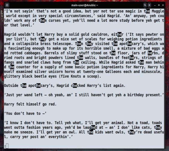 Терминал переключится в полноэкранный режим просмотра. Командная строка исчезнет, файл займёт весь экран.
